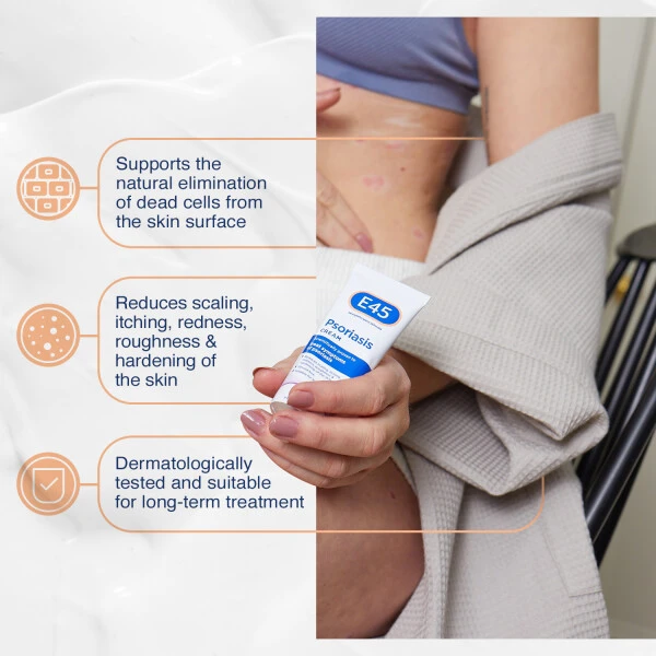 Soften and treat rough and itchy skin with E45 Psoriasis Cream. It contains Ectoin, a natural cell-protective molecule with inflammation-reducing and membrane-stabilising properties. E45 Psoriasis Cream supports the natural elimination of dead cells from the skin surface and thereby reduces roughness and hardening of psoriasis plaques. E45 reduces scaling, itching and redness of the skin by moisturizing the skin and preventing it from further dehydration. E45 Psoriasis Cream stabilises the skin barrier and helps to control the skin cell production and maturation time of the skin. This Cream relieves, and calms irritated and damaged skin by reducing inflammatory reactions and supporting the regeneration process. The brown glass bottle protects the contents from the light but still enables them to be seen.