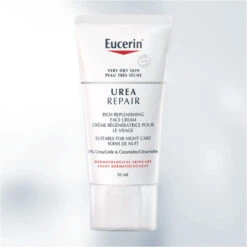 Eucerin UreaRepair rich replenishing face cream 5% Urea uses two naturally occurring compounds found within the skin, Urea and Lactate, this night cream helps to bind in moisture, helping to reduce the feeling of tightness and smooths dry or flaky facial skin. Dry skin is lacking moisture, but also binding substances. Urea and Lactate help to replenish dry skin with these substances, restoring natural moisture.his face cream is also non-greasy, for easy and quick absorption by your skin.