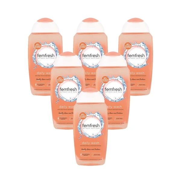 Femfresh Daily Intimate Wash 6 Pack has a low pH and helps to protect against irritations that are generally caused by ordinary soap. It has been enriched with aloe vera and camomile and has been specifically formulated to gently cleanse and refresh the intimate areas of a woman whilst helping to maintain a healthy pH balance.?This product is also enriched with aloe vera and camomile, has been specially formulated to gently cleanse and refresh the intimate area whilst helping to maintain a healthy pH-balance.