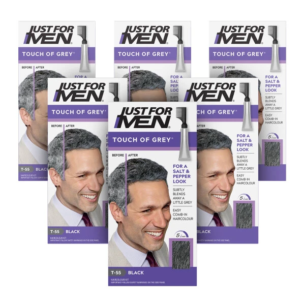 Just For Men Touch of Grey Hair Dye Black T-55 6 Pack allows you to still have that touch of grey to your hair, but not so much that it covers your vitality. Touch of Grey is incredibly easy to use and allows you to decide how much or how little grey you want to keep. It is available in all hair shades and the ammonia and peroxide-free formula conditions your hair, so that it is left looking completely natural and in great condition. With no mixing, there?s no mess and the process takes just 5 minutes!