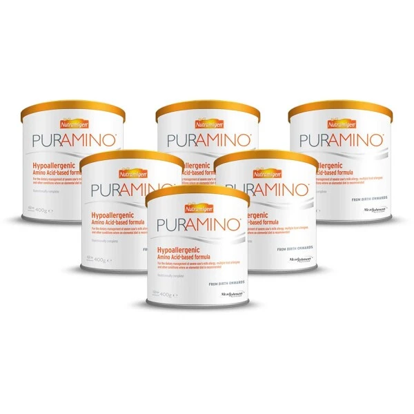 Nutramigen Puramino is an amino acid-based formula that has been specifically designed for infants and young children with a severe cow’s milk allergy, multiple food allergies or other indications that require an amino acid-based formula. This formula is suitable for infants from birth onwards when bottle-fed and for young children. Nutramigen Puramino is nutritionally complete, meaning it can be used as the sole source of nourishment for infants up to 6 months of age, or as part of a mixed diet for older children.