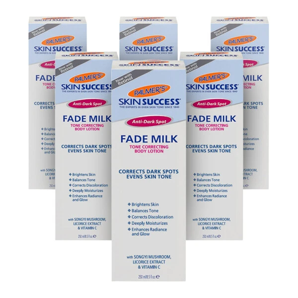 Palmer’s Skin Success Anti-Dark Spot Fade Milk Six Pack is a tone correcting body lotion that targets pigment-prone areas such as knees, elbows, feet and d?colletage to help correct unwanted discoloration. Skin discoloration is not limited to your face. Dark spots and uneven skin tone can appear all over the body, typically caused by sun exposure, acne scars, pregnancy, or even severe dryness.