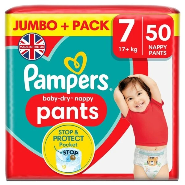 Pampers Baby-Dry Size 7 Nappy Pants Jumbo Pack are easy to pull on and take off with tear away sides. Their all-round fit adapts to baby?s movements to provide comfort and fit. Air channels let air flow freely inside the nappy pant for up to 12 hours of breathable dryness. Make changing time quick and easy with Pampers Baby-Dry Nappy Pants, wherever baby is crawling! Use with Pampers wipes.