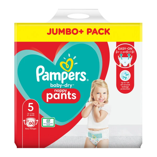 Pampers Baby-Dry Size 5 Nappy Pants Jumbo Pack are easy to pull on and take off with tear away sides. Their all-round fit adapts to baby?s movements to provide comfort and fit. Air channels let air flow freely inside the nappy pant for up to 12 hours of breathable dryness. Make changing time quick and easy with Pampers Baby-Dry Size 5 Nappy Pants Jumbo Pack, wherever baby is crawling! Use with Pampers wipes.