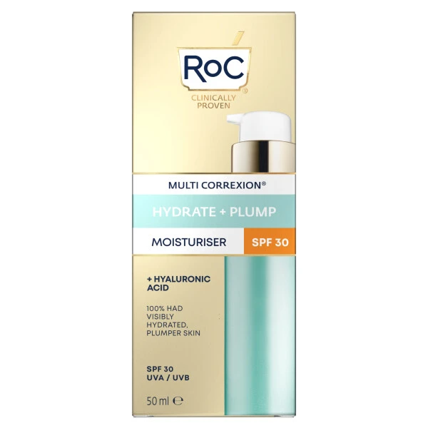 RoC Multi Correxion Hydrate & Plump Moisturiser SPF30 starts your day by deeply hydrating, visibly plumping, and protecting the skin. Immediately increase hydration levels and visibly plump the skin. After 1 week fine lines and wrinkles are visibly reduced. This gel-cream formula is powered by pure Hyaluronic Acid to quench thirsty, deflated skin to plump away visible lines and wrinkles. Added SPF30 provides broad spectrum protection from UVA/UVB rays to prevent future skin damage which may lead to premature ageing. This breakthrough formula is invisible on all skin tones.