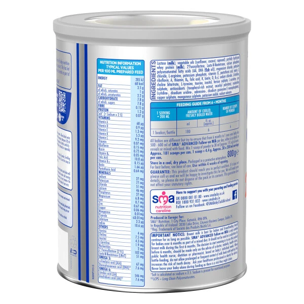 SMA Advanced Follow On Milk is specifically tailored to complement a weaning diet. Enriched with essential nutrients, including Zinc and Vitamins A, C & D to support the normal function of the immune system, and Iron to support normal cognitive development. SMA Advanced Follow On Milk also contains 2’FL and LNnT.