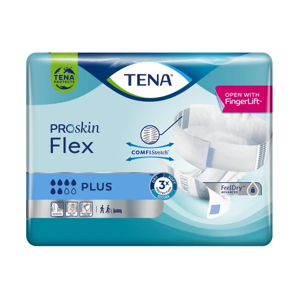 TENA Flex Plus is a flexible belted incontinence brief designed to allow easier and more ergonomic product changes, suitable for people who are mobile, semi-mobile or immobile. For outstanding protection TENA ProSkin Flex with FeelDry Advanced quickly draws the liquid away from the surface, keeping the skin dry. The super absorbing, fast acting core then rapidly locks in urine, even in larger quantities, for dryness and the fully breathable ConfioAir? back-sheet allows skin to breathe. All these features help to maintain natural skin health. The adjustable ComfiStretch belt enables a body-close fit to increase comfort and provide better security against leaks. For ease of use, the belt has easy-grip hooks which can be fastened at the front and are fully adjustable to suit different body types.