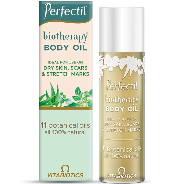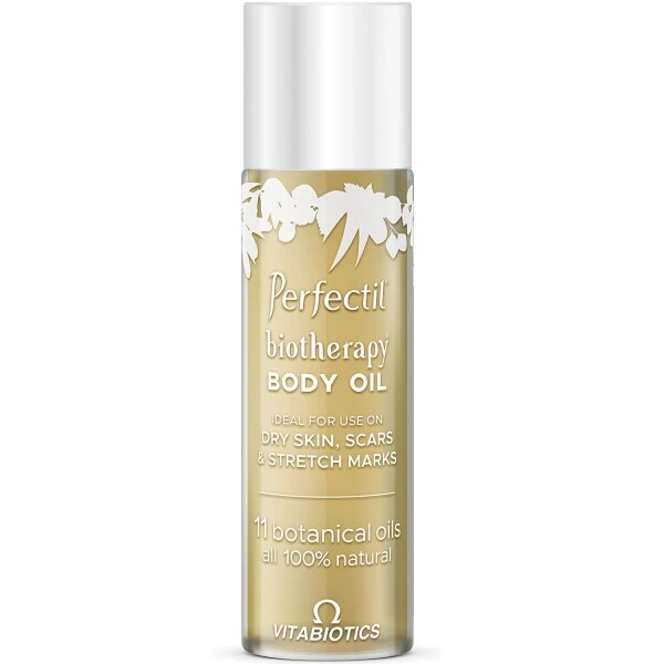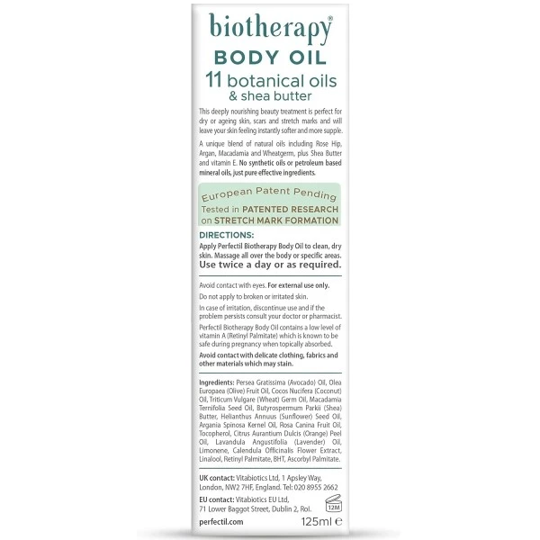 Vitabiotics Perfectil Biotherapy body oil has been specially designed to contain 100% natural oils including Rose Hip, Argan, Coconut, Avocado, Macadamia and Wheatgerm Oil, plus Shea Butter and vitamin E and A. This unique blend of natural ingredients works to gently protect and nourish dry and stretching skin. Vitamin E contains antioxidant properties which work to protect your skin from free radicals that can cause premature skin ageing. Vitamin A contains anti-ageing properties that support the improvement of your skin tone, texture and elasticity by assisting in the formation of collagen production, leaving your skin looking firmer and youthful.