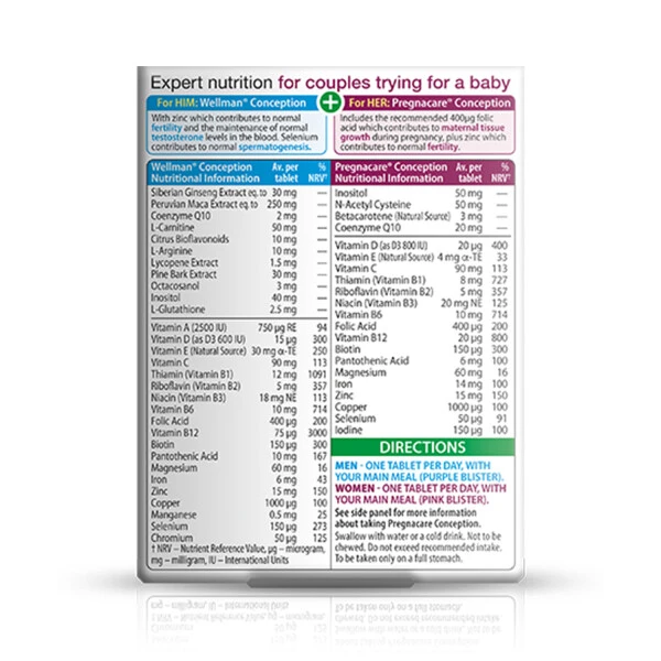 Vitabiotics Pregnacare Him & Her Conception Tabletsare designed to work differently for both men and women to provide couples with the nutritional requirements they need in order to maintain great reproductive health.
