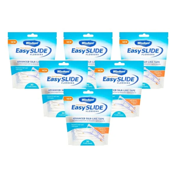 - 6 packs of Wisdom Clean Between Easy Slide Flossers (30 pieces each)